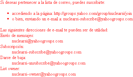 a Se anima a los nuevos miembros a presentarse ellos mismos. Cuando te suscribas, envia un mensaje breve a la lista explicando quien eres y tu interes en el tema de la lista. Los mensajes que envies a la lista seran recibidos por decenas, o quizas centenares, de personas. Por respeto a todos, deberias seguir las normas usuales de cortesia en listas de correo: * Evita firmas (signatures) largas